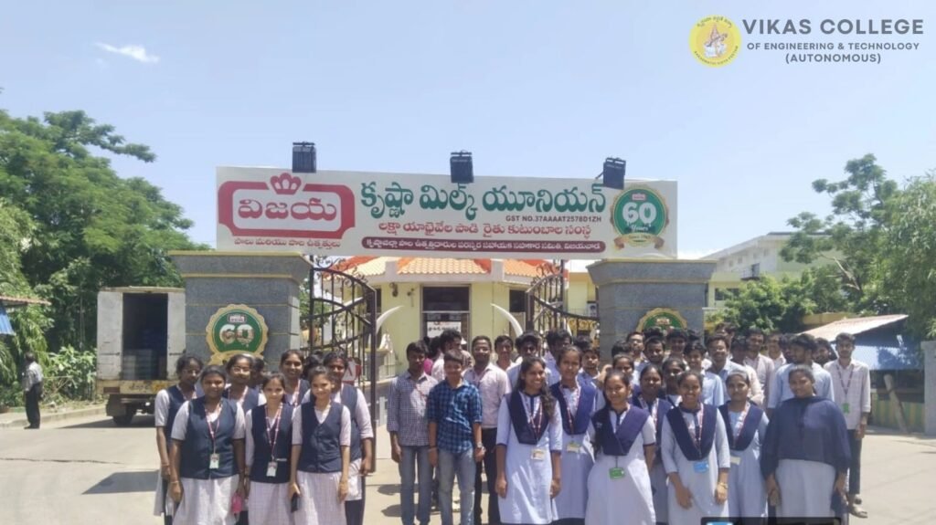 The Department of Electronics and Communication Engineering (ECE) at Vikas College of Engineering & Technology (Autonomous), VCTN, successfully organized an Industrial Visit to the Krishna District Milk Producers’ Co-operative Union Ltd (Milk Products Factory, Vijayawada) on 6th September 2025. 🏭🥛