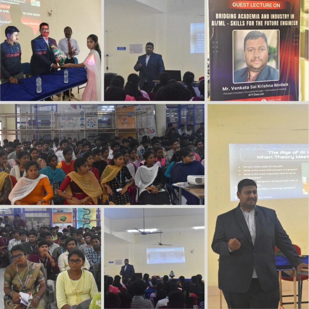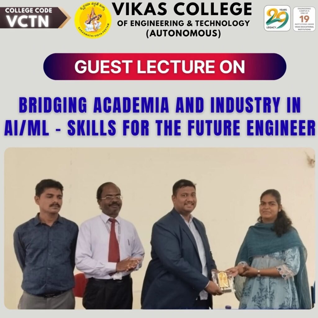 The Department of Computer Science and Engineering (CSE) and CSE Allied Branches at Vikas College of Engineering & Technology (VCTN) had the privilege of hosting Mr. Venkata Sai Krishna Modala, Principal Consultant / Consulting Manager – NTT Data Ltd., for an insightful and inspiring guest lecture on bridging the gap between academic learning and industry demands in AI/ML.